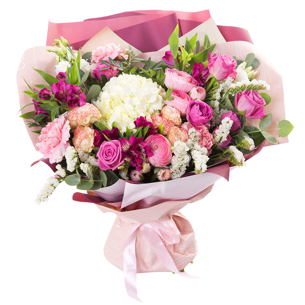 Букет из роз, гвоздик, ранункулюсов и гортензии