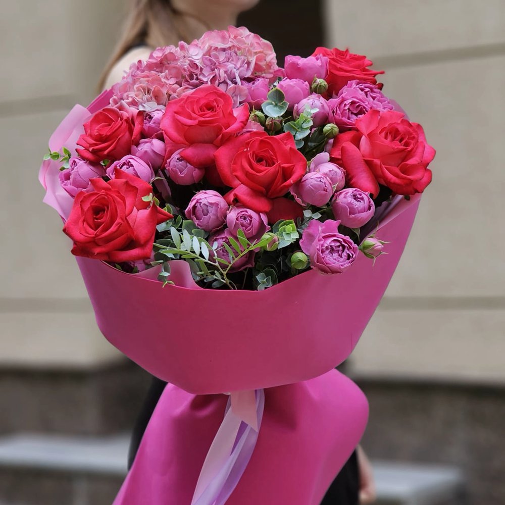 Букет из пионовидных роз и гортензии