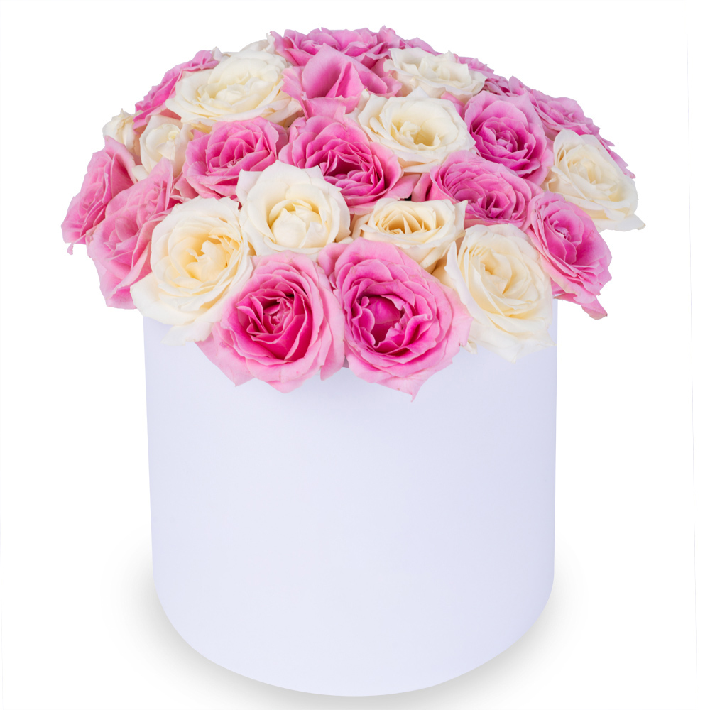 25 разноцветных роз premium в белой шляпной коробке