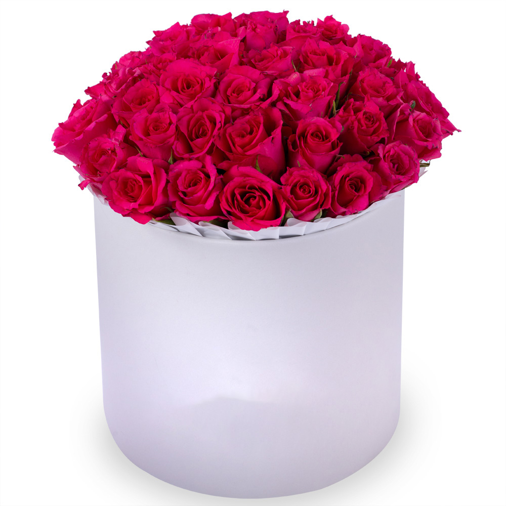 35 малиновых роз в белой шляпной коробке