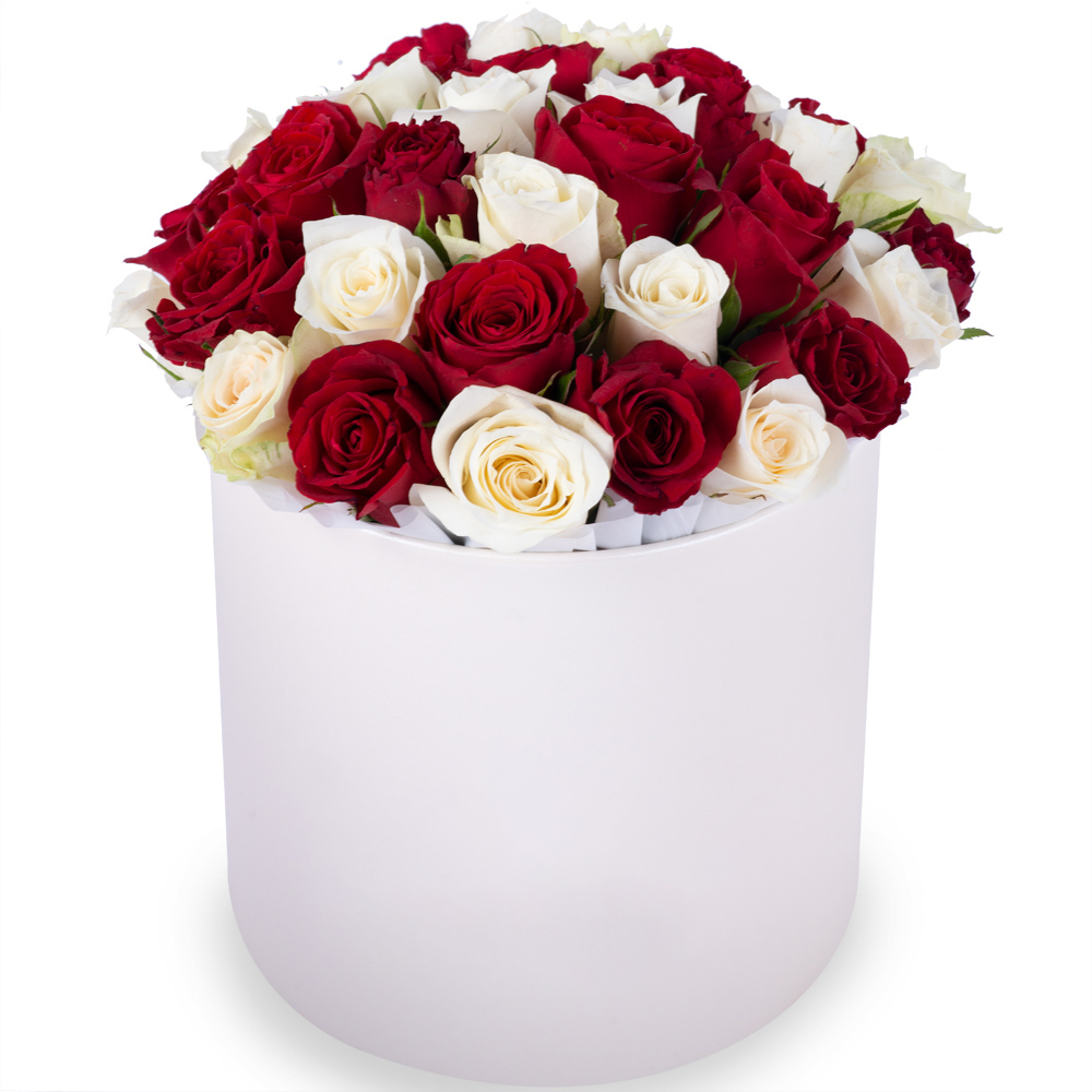 35 разноцветных роз в кремовой шляпной коробке