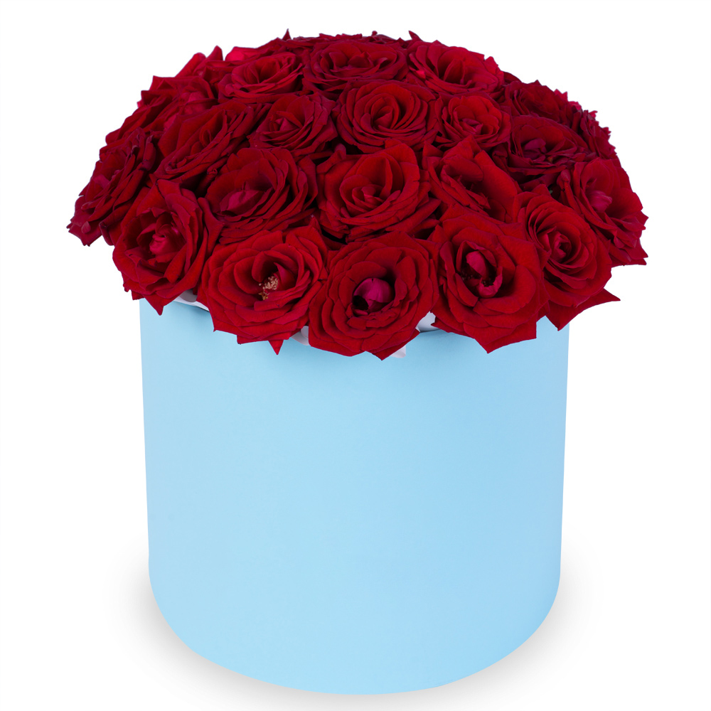 25 красных роз premium в голубой шляпной коробке