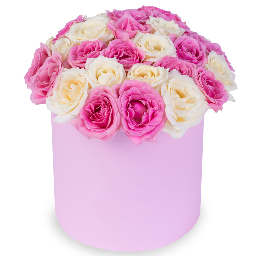 25 разноцветных роз premium в розовой шляпной коробке