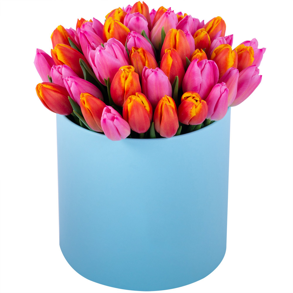 Букет микс из 51 тюльпана в голубой шляпной коробке