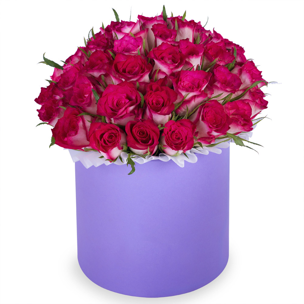 Букет из 51 бело-малиновой розы в фиолетовой шляпной коробке