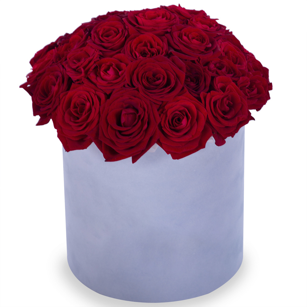 Букет из 35 красных роз premium в серой бархатной шляпной коробке