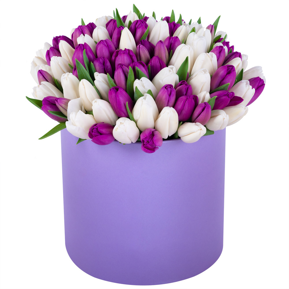 101 разноцветный тюльпан в фиолетовой шляпной коробке