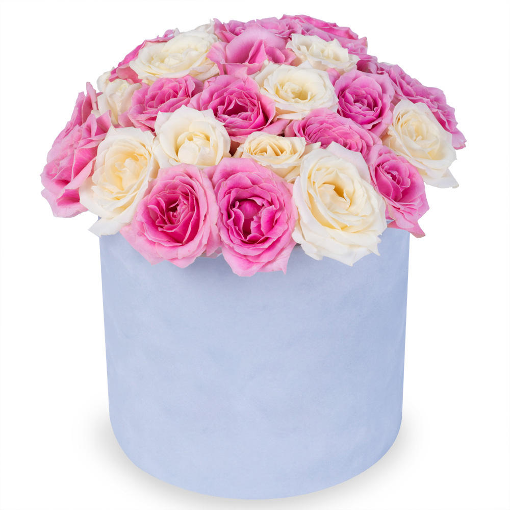 25 разноцветных роз premium в бархатной шляпной коробке