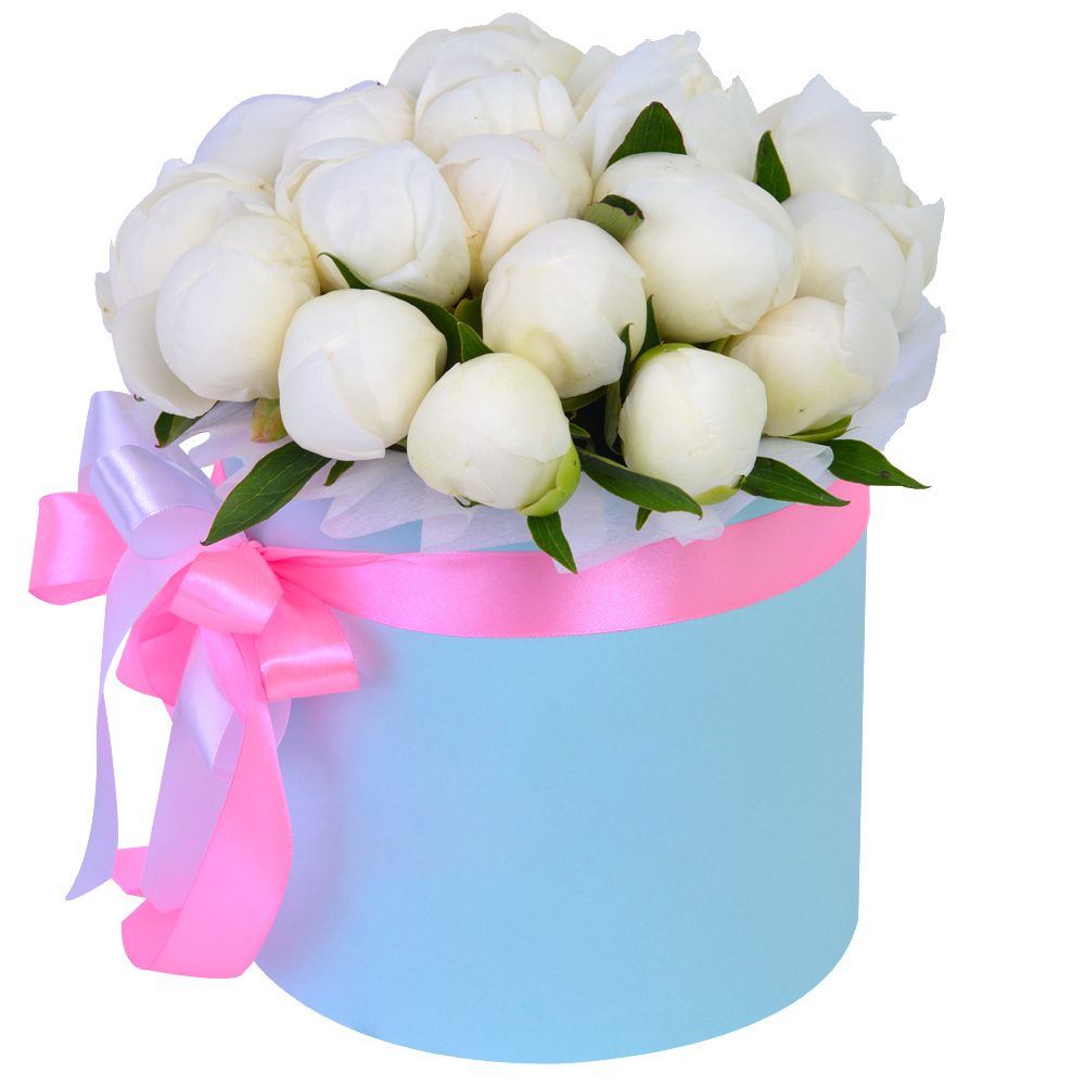 Букет из 19 белых пионов в голубой шляпной коробке
