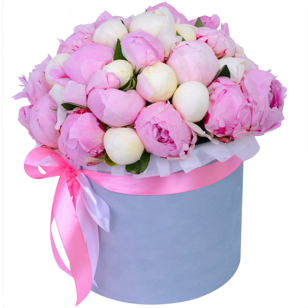 Букет из 35 разноцветных пионов в серой бархатной шляпной коробке