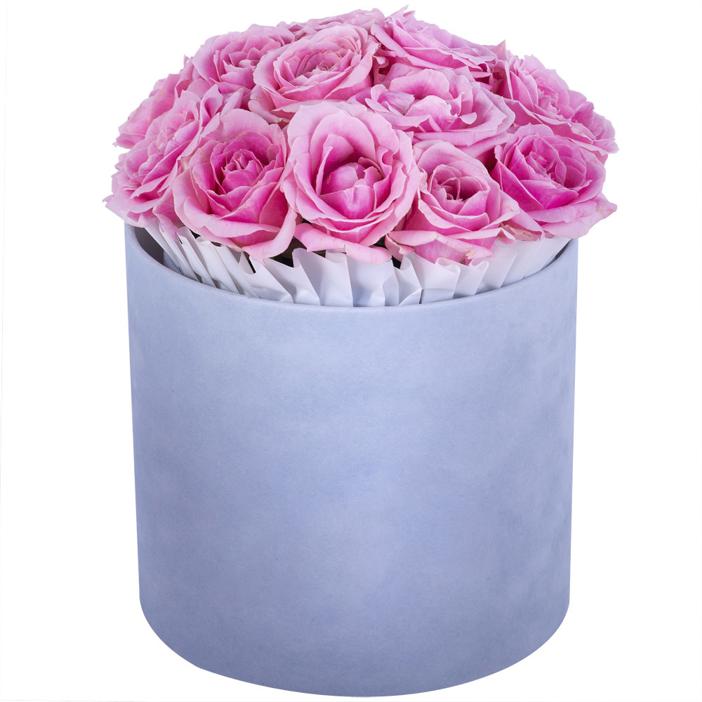 Букет из 15 розовых роз premium в серой бархатной шляпной коробке