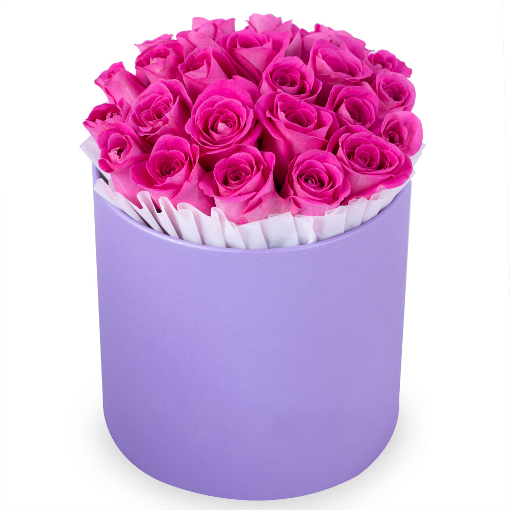 25 розовых роз в фиолетовой шляпной коробке