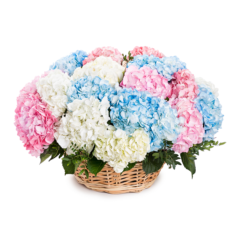 Корзина из 25 разноцветных гортензий