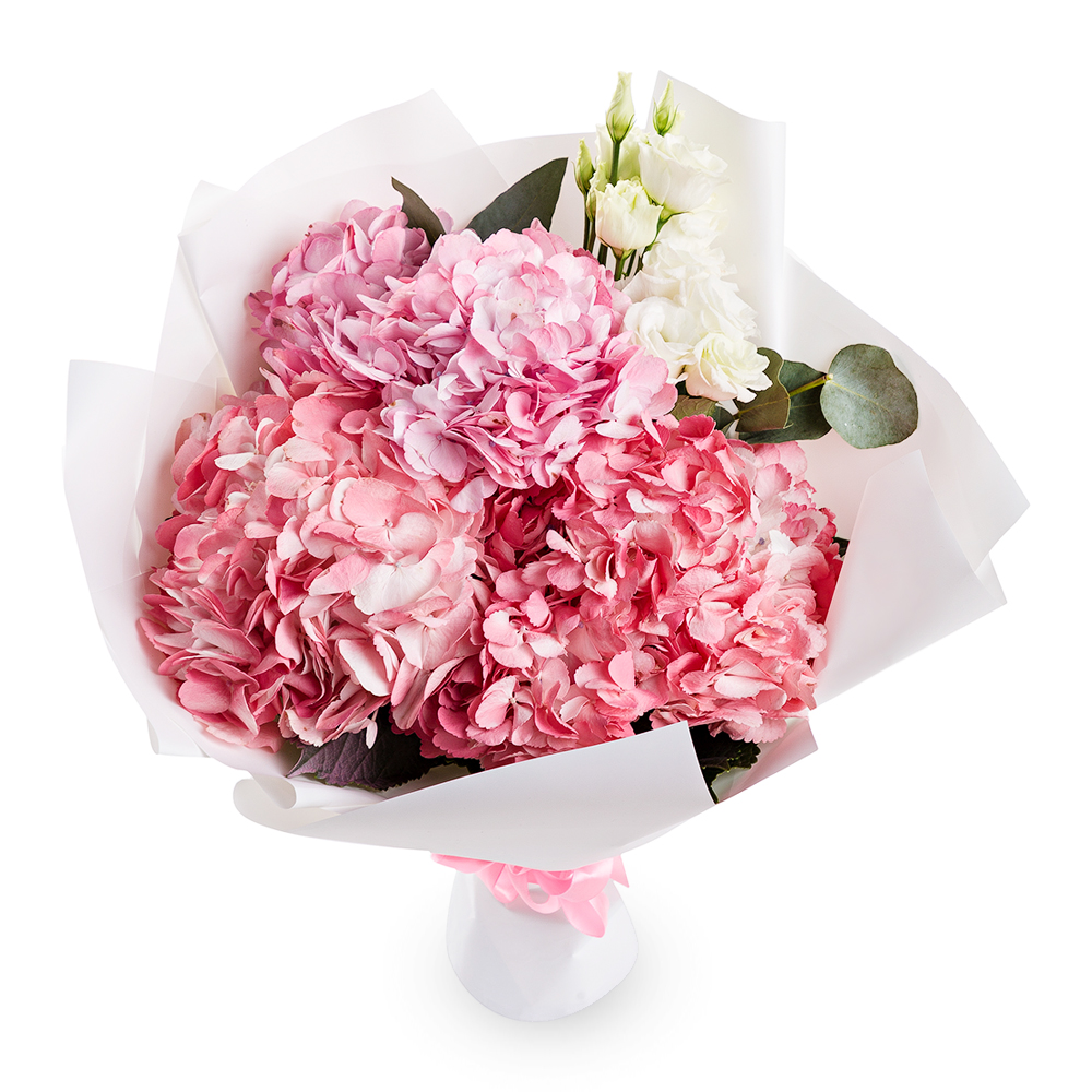 Букет с гортензией, эустомой и эвкалиптом