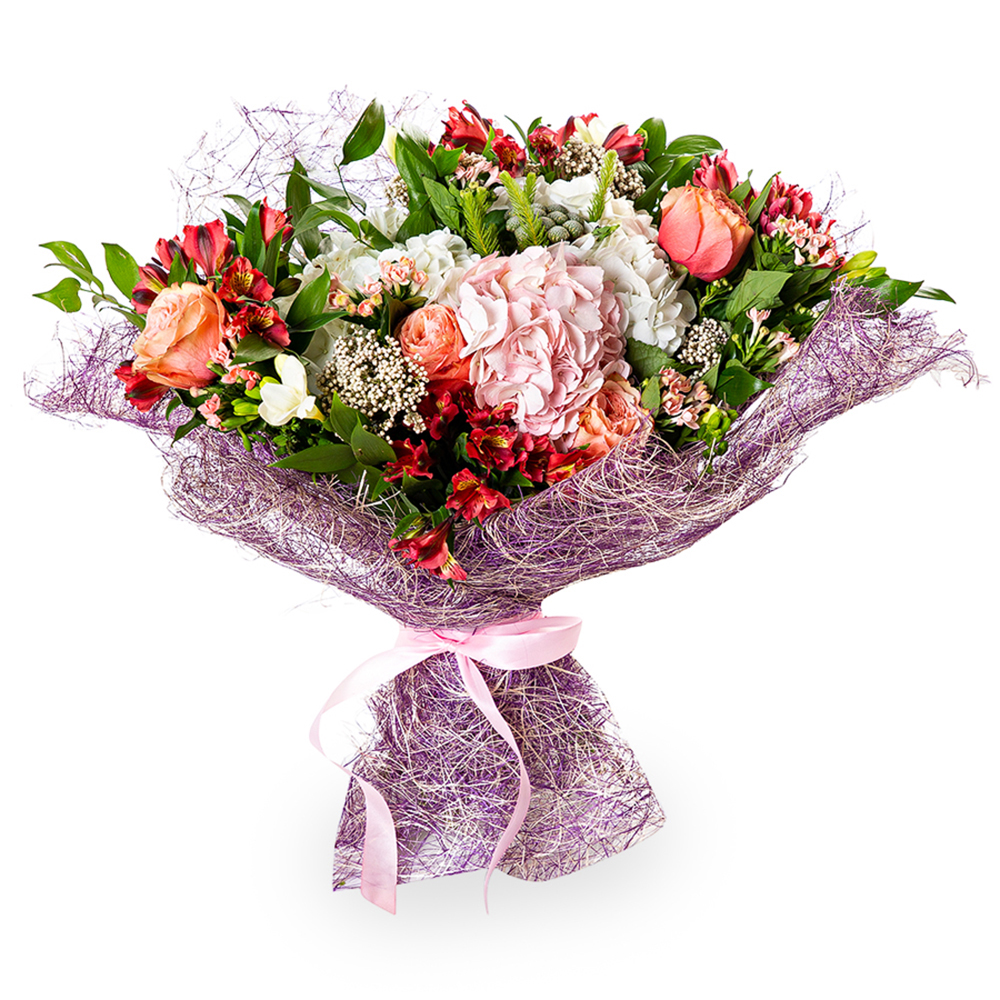 Букет с гортензией, пионовидной розой и альстромерией