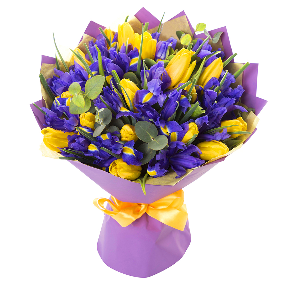 Букет из тюльпанов, ирисов и эвкалипта