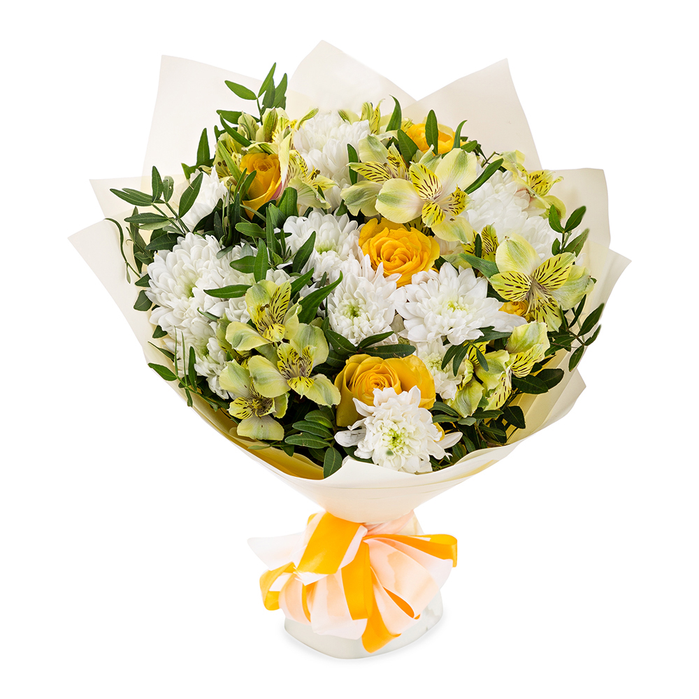 Букет из роз, хризантем и альстромерий в пленке