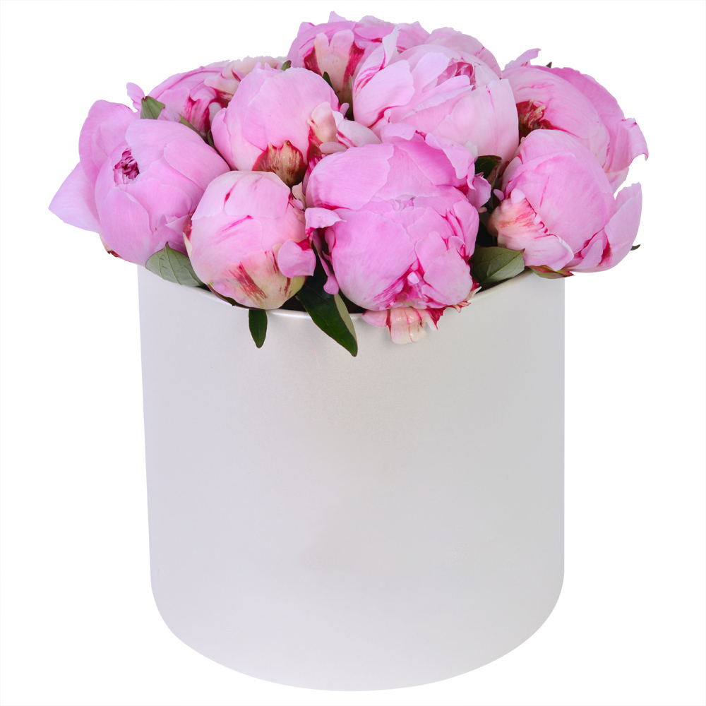 Букет из 11 розовых пионов в кремовой шляпной коробке