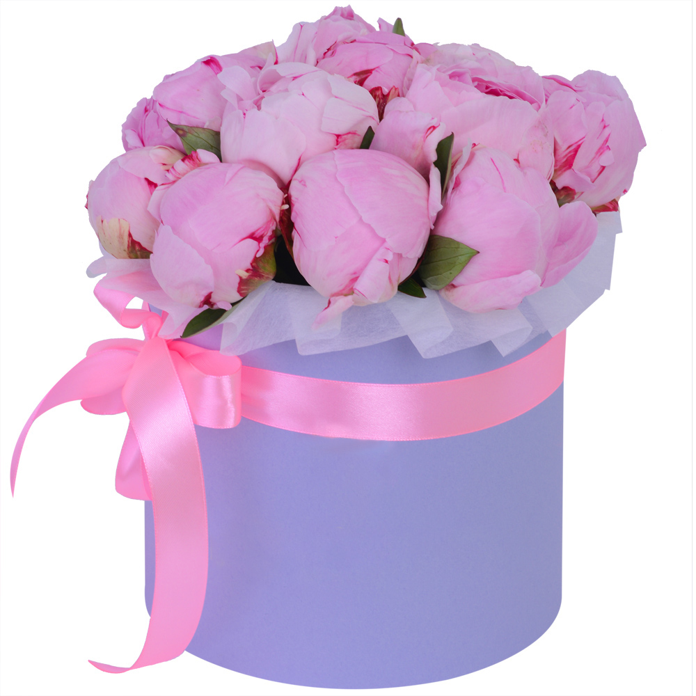 Букет из 15 розовых пионов в фиолетовой шляпной коробке
