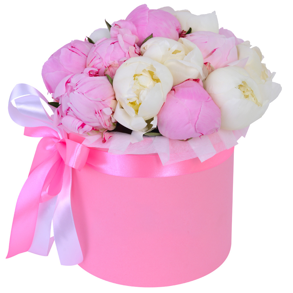 Букет из 11 разноцветных пионов в розовой шляпной коробке