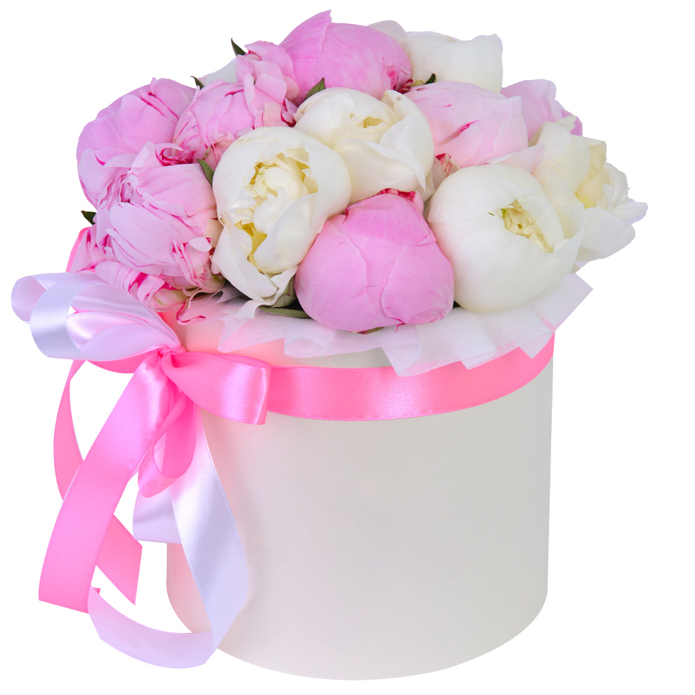 Букет из 11 разноцветных пионов в кремовой шляпной коробке