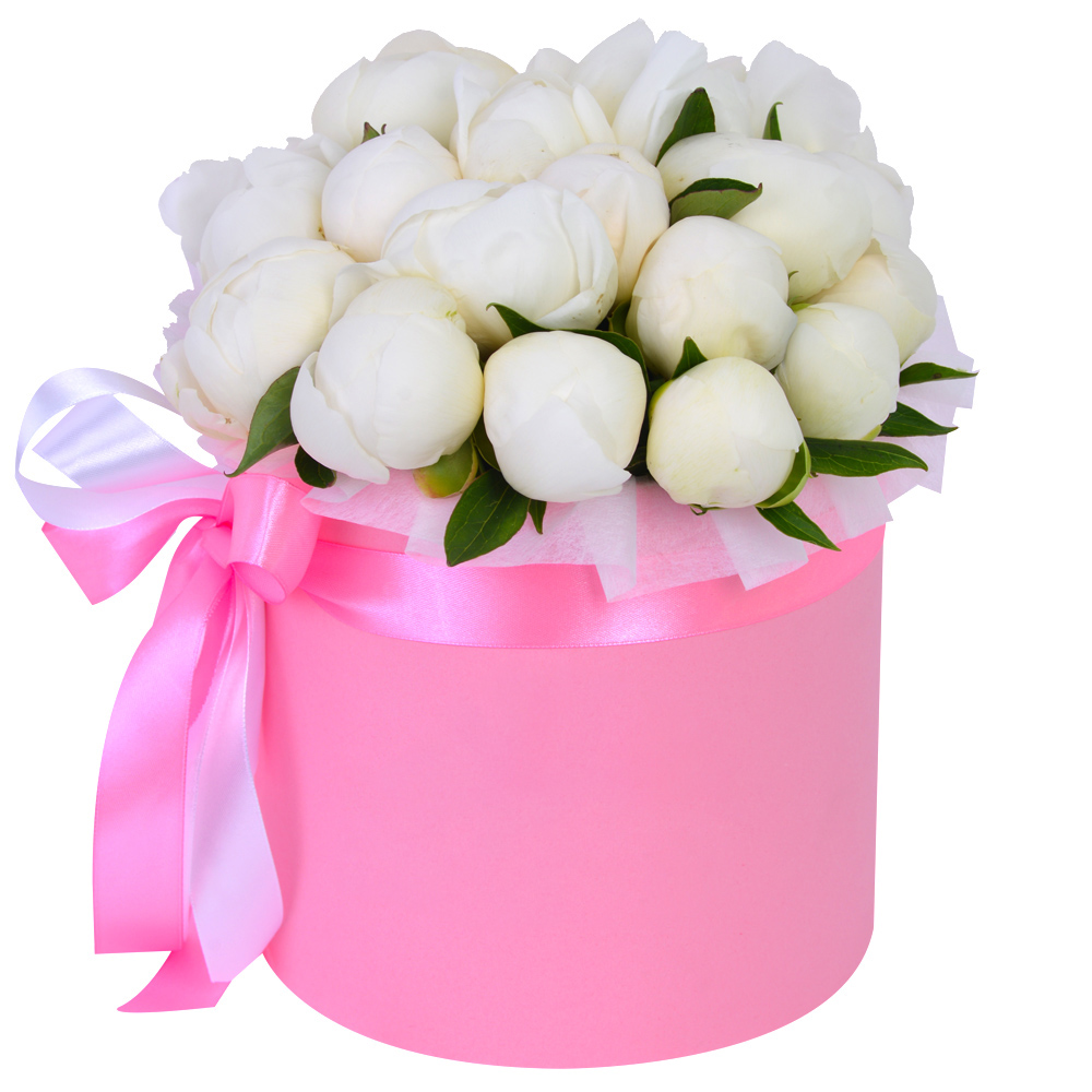 Букет из 19 белых пионов в розовой шляпной коробке