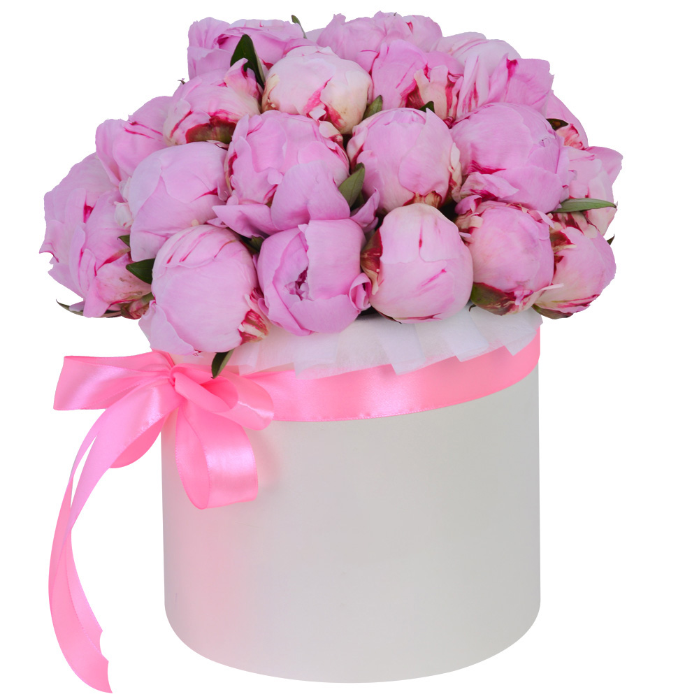 Букет из 25 розовых пионов в кремовой шляпной коробке