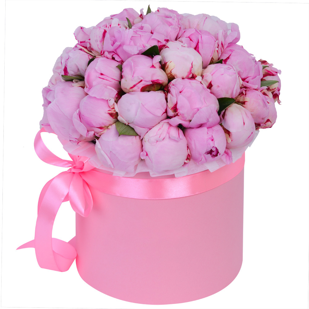 Букет из 35 розовых пионов в розовой шляпной коробке