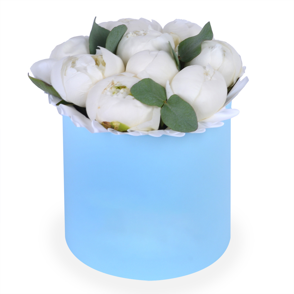 Букет из 9 белых пионов в шляпной коробке с эвкалиптом