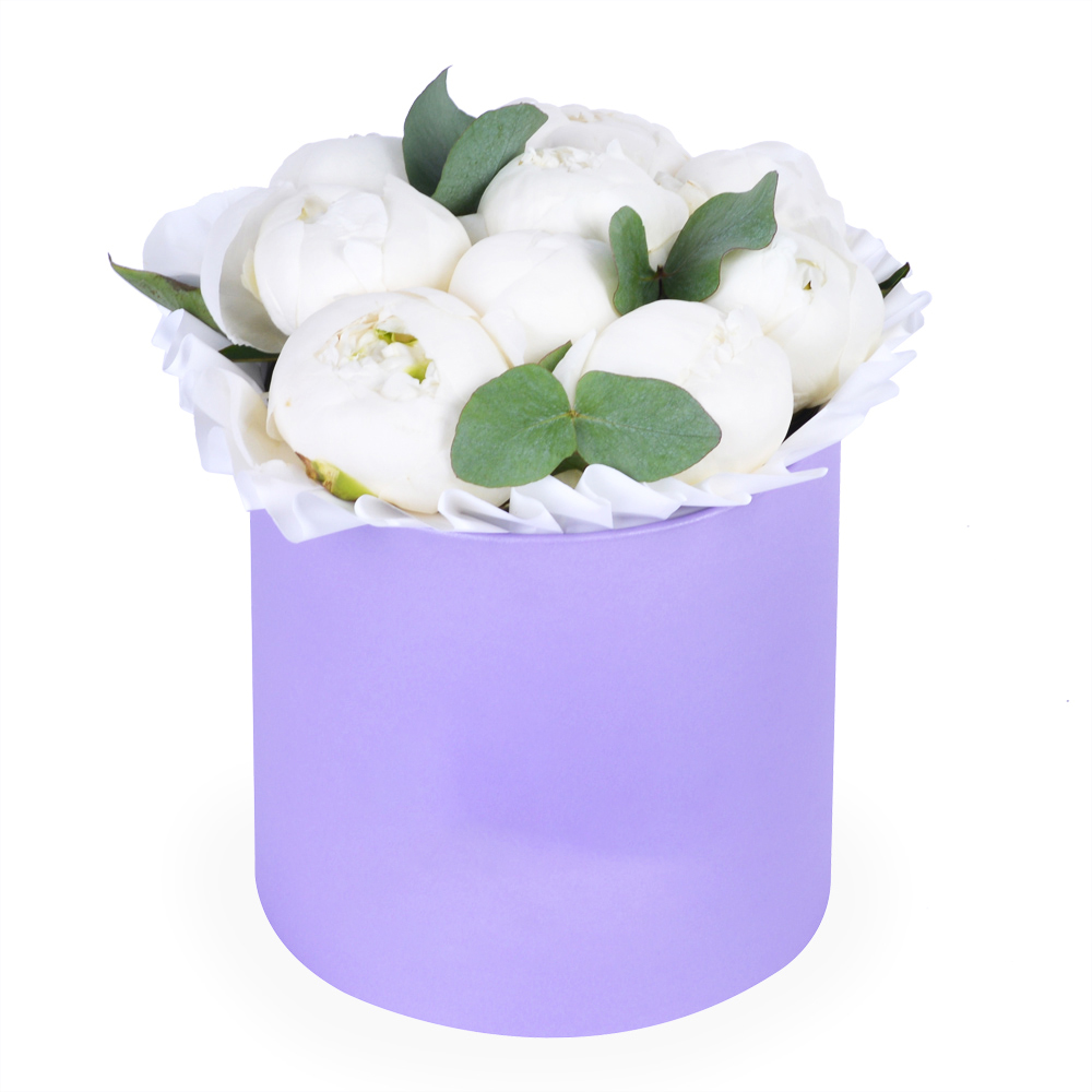 Букет из 9 белых пионов в фиолетовой шляпной коробке с эвкалиптом