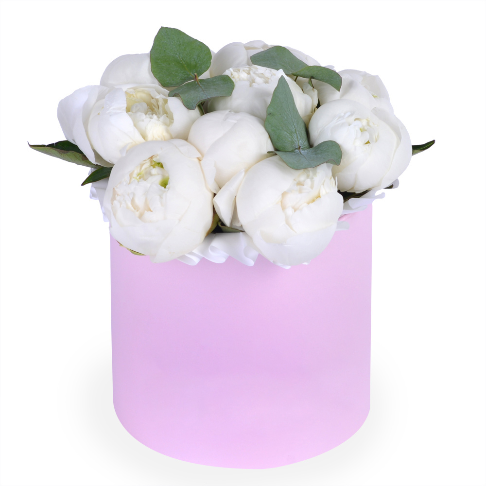 Букет из 9 белых пионов с эвкалиптом в розовой шляпной коробке