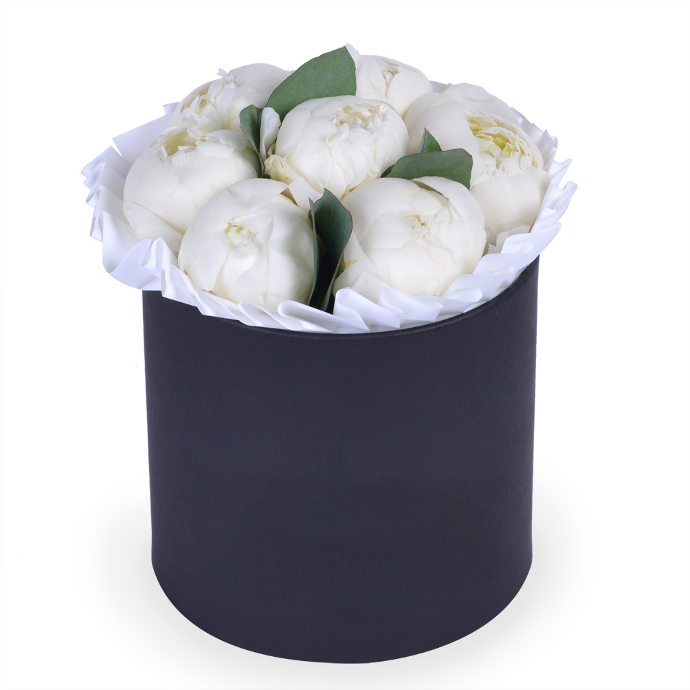 Букет из 7 белых пионов в шляпной коробке с эвкалиптом