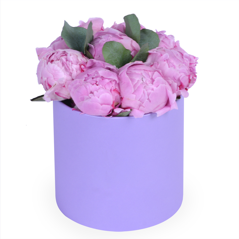 Букет из 9 розовых пионов эвкалиптом в шляпной коробке
