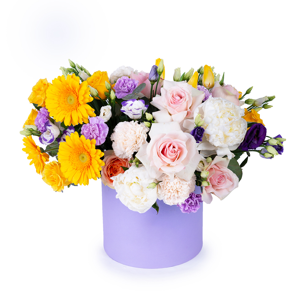 Букет в шляпной коробке из роз, гербер и хризантем