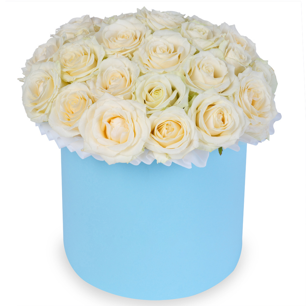 Букет из 25 белых роз premium в голубой шляпной коробке