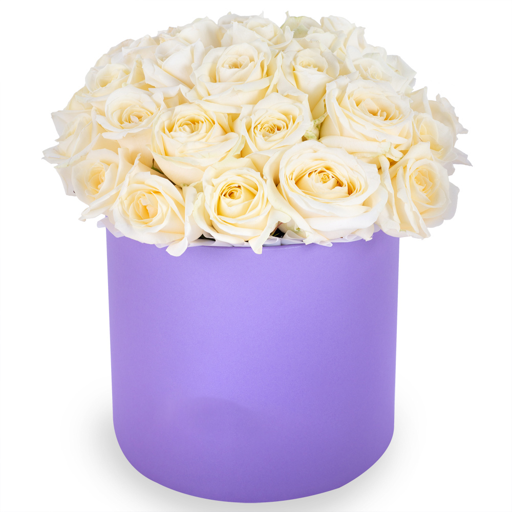 Букет из 35 белых роз premium в фиолетовой шляпной коробке