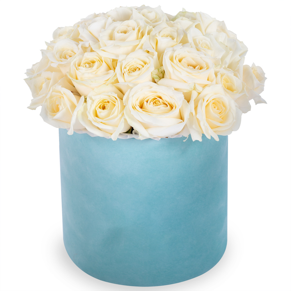 Букет из 35 белых роз premium в зеленой бархатной шляпной коробке