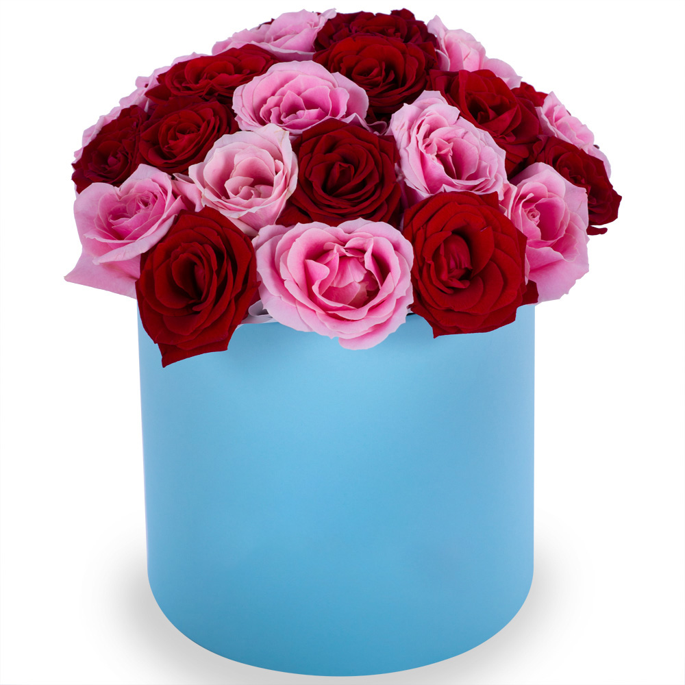 Букет из 35 разноцветных роз premium в голубой шляпной коробке