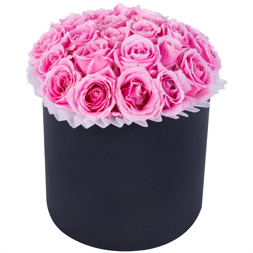 Букет из 21 розовой розы premium в черной шляпной коробке