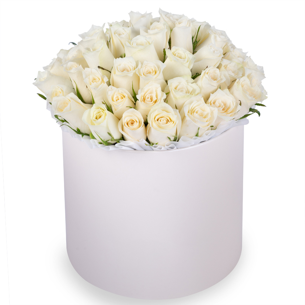 51 белая роза в белой шляпной коробке