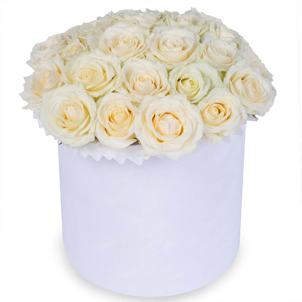 25 белых роз premium в белой шляпной коробке