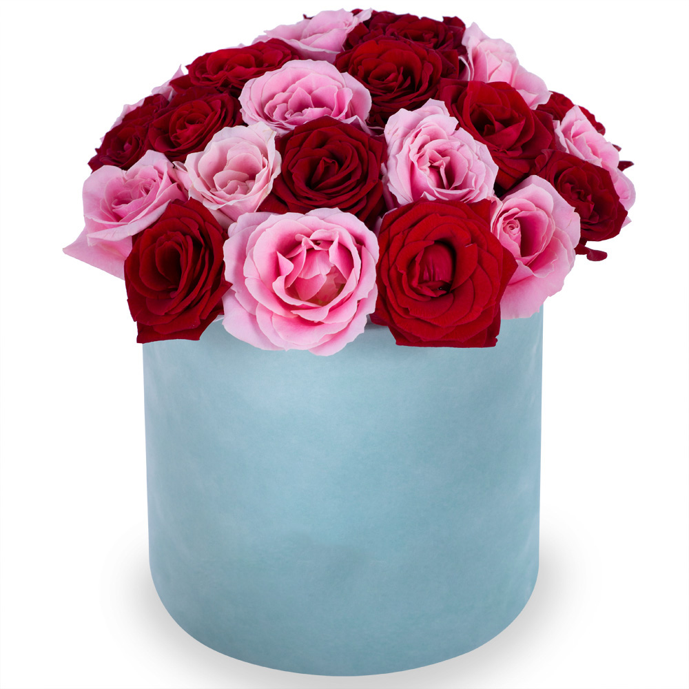 Букет из 35 разноцветных роз premium в зеленой бархатной шляпной коробке