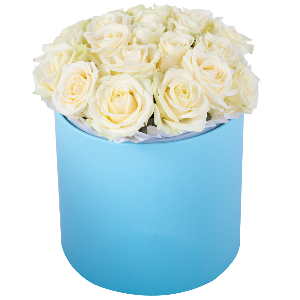 Букет из 21 белой розы premium в голубой шляпной коробке