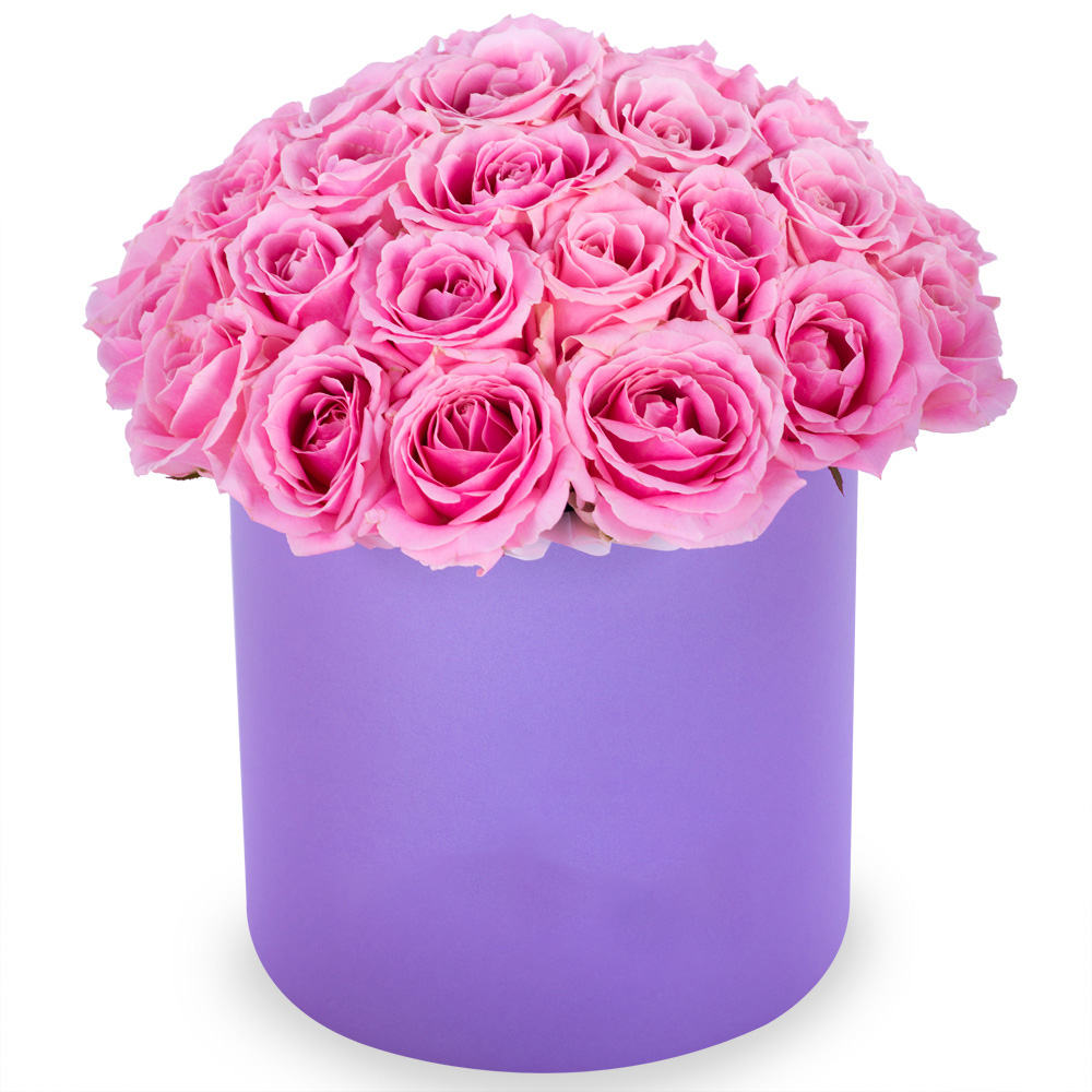 Букет из 35 розовых роз premium в фиолетовой шляпной коробке