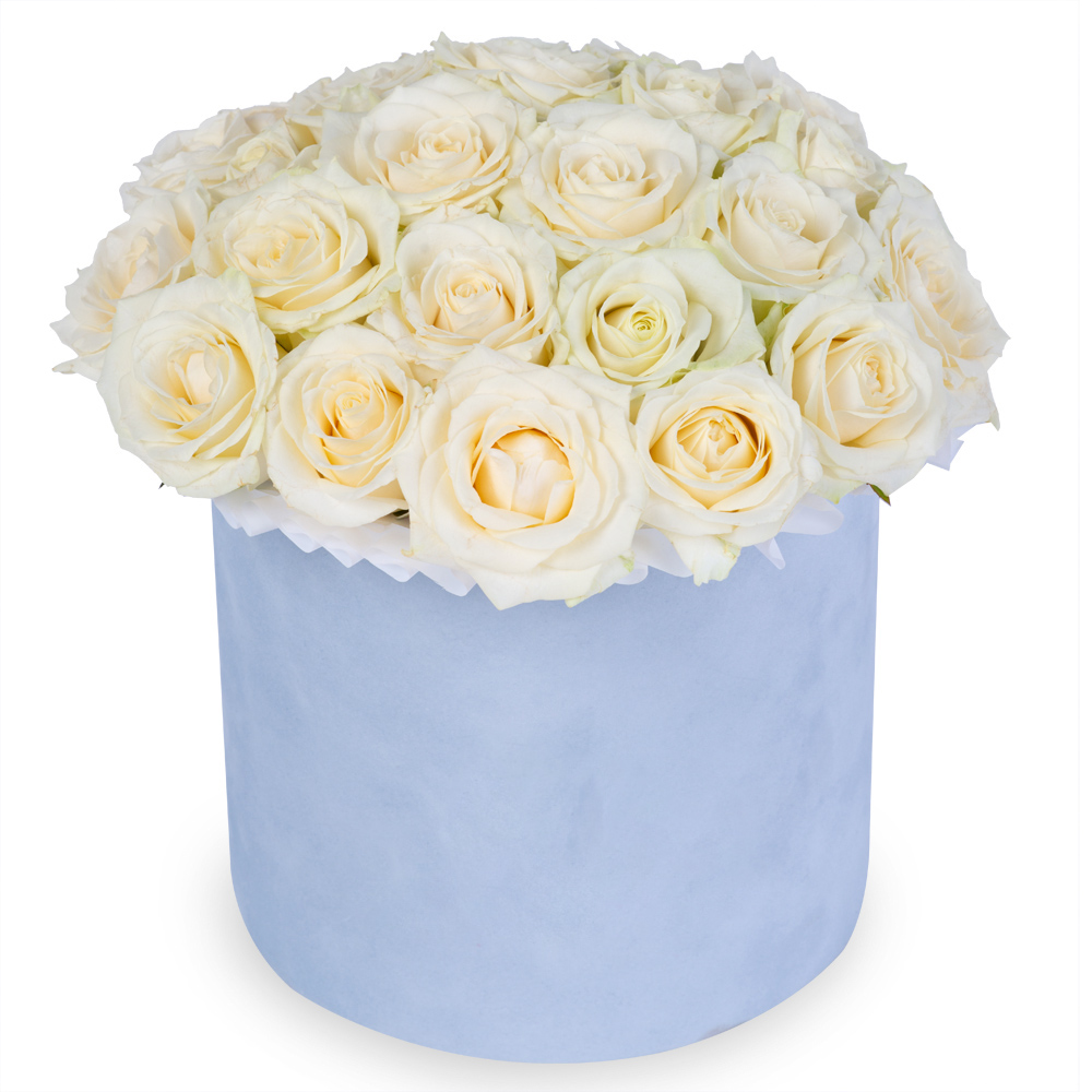 Букет из 25 белых роз premium в серой бархатной шляпной коробке