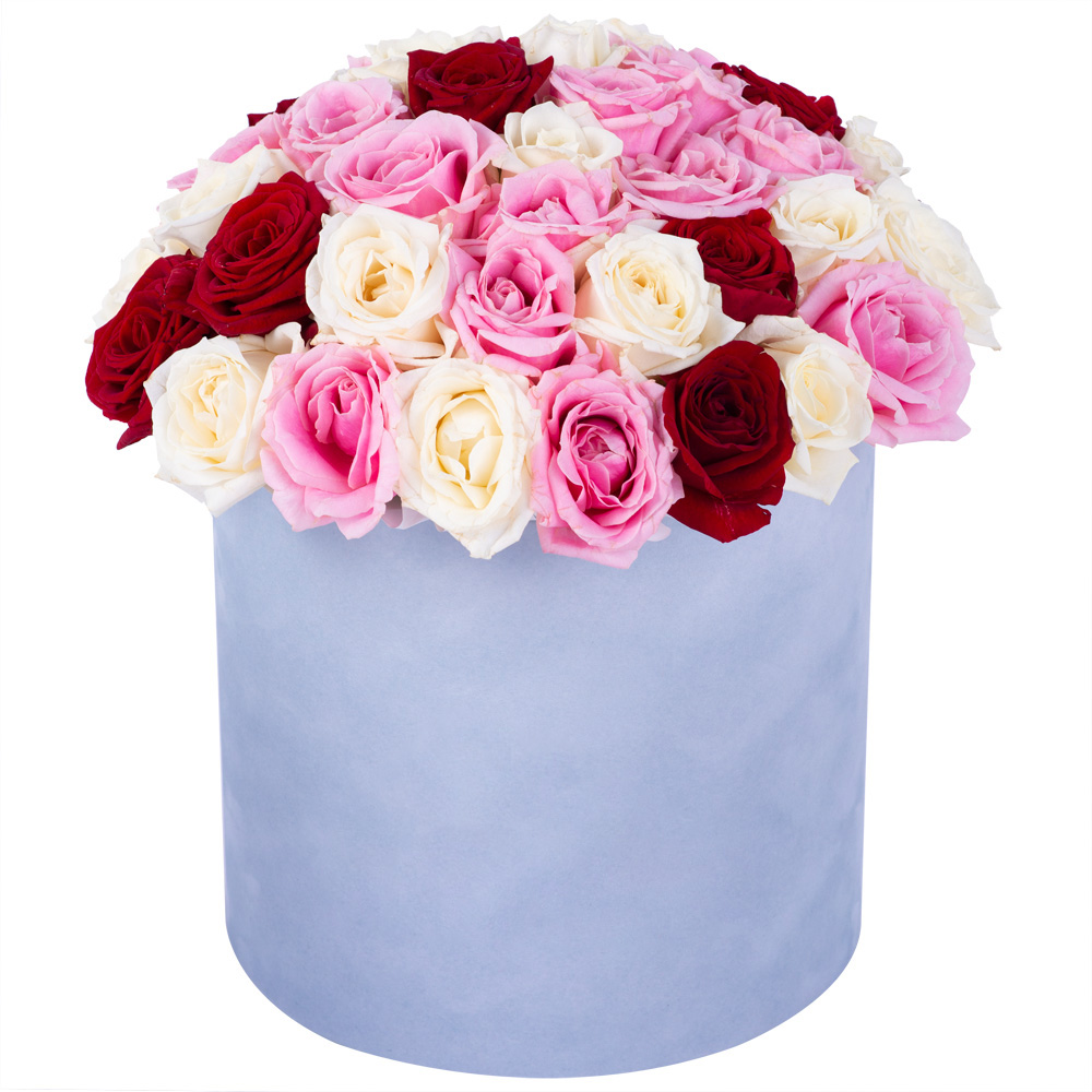 Букет из 51 разноцветной розы premium в серой бархатной шляпной коробке