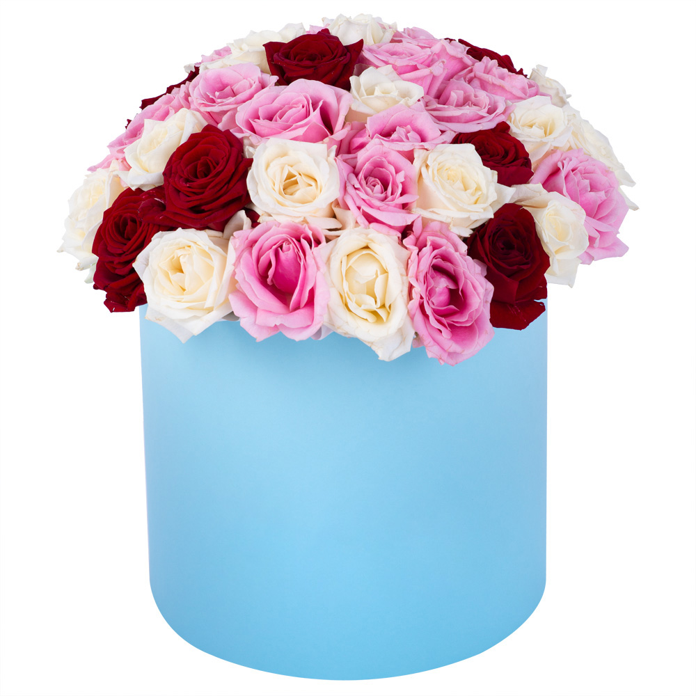 Букет из 51 разноцветной розы premium в голубой шляпной коробке
