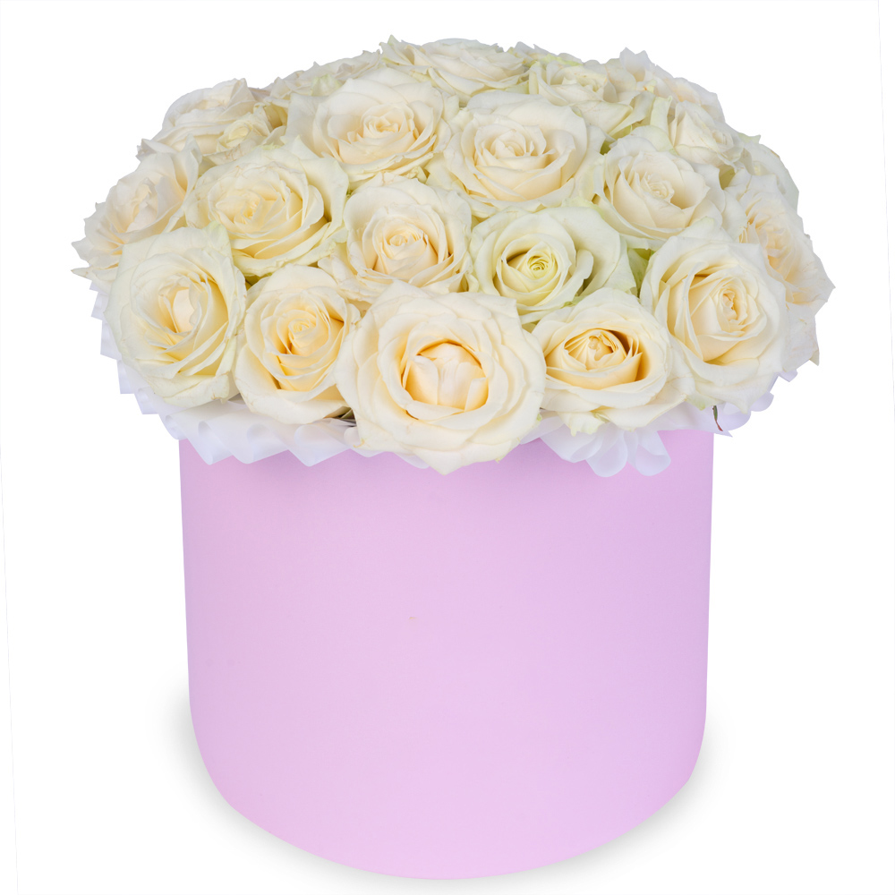 25 белых роз premium в розовой шляпной коробке