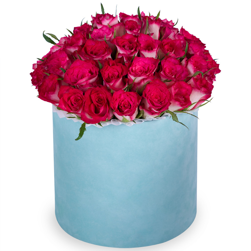 Букет из 51 бело-малиновой розы в зеленой бархатной шляпной коробке