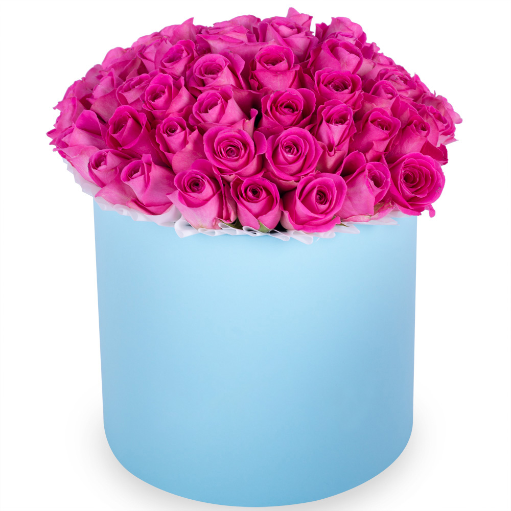 Букет из 51 розовой розы в голубой шляпной коробке